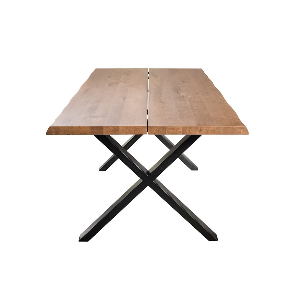Découvrez la table à manger Triest avec un plateau en chêne renforcé de plaques métalliques et un look optique. Personnalisable de 1400 à 2400 mm pour un design sophistiqué dans votre maison.